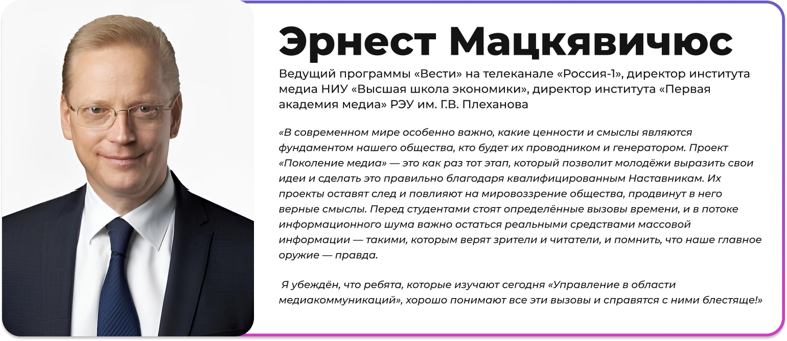 Управление в области медиакоммуникаций – направление для тех, кто мыслит целыми проектами и мечтает покорить медиаиндустрию. Научим создавать и продвигать медиапроекты, управлять командой, общаться с аудиторией и профессионально делать контент для любых площадок и форматов — от авторского Telegram-канала до крупного СМИ. Своим опытом с участниками поделятся журналисты, теле- и радиоведущие, медиаменеджеры и руководители пресс-служб федеральных проектов и организаций.